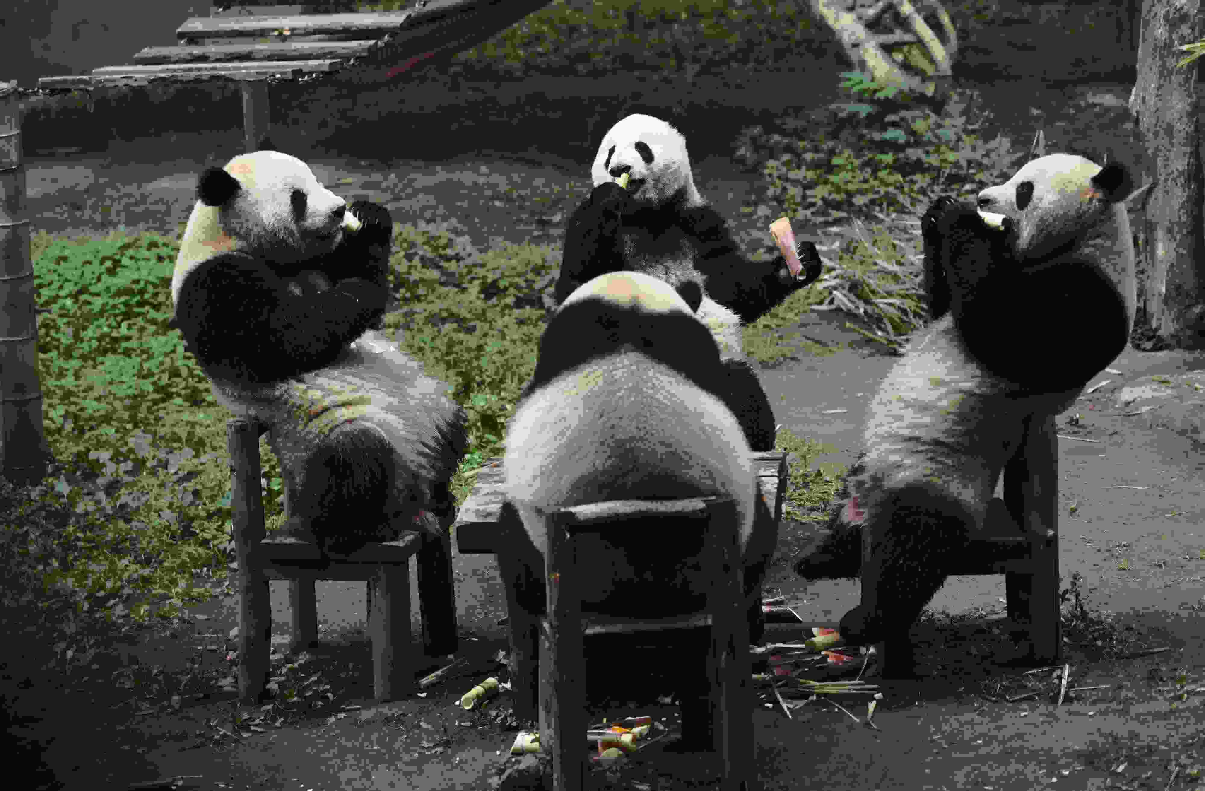 2023年5月21日,在重慶動物園內(nèi),大熊貓圍桌而坐,享用美食,萌態(tài)十足。 視覺中國