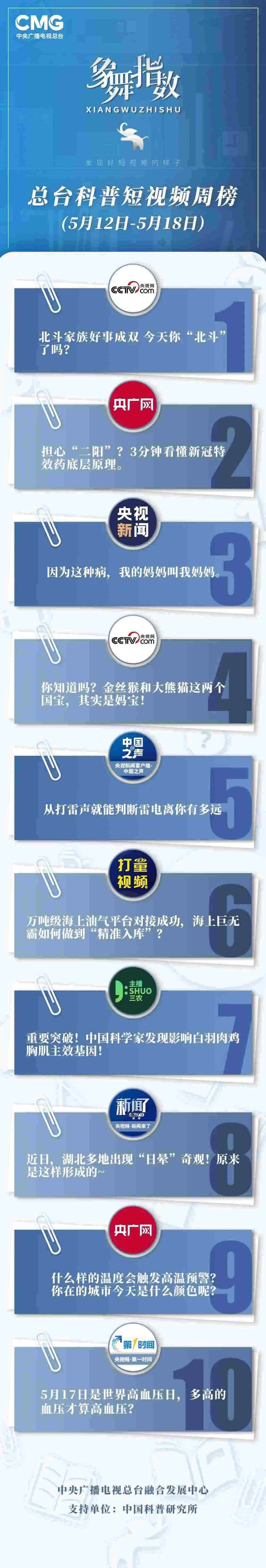 中央廣播電視總臺(tái)“象舞指數(shù)”評(píng)議品牌,推出科普短視頻周榜、總臺(tái)科普短視頻周榜。在2023年5月12日-5月18日,值得注目的內(nèi)容有: