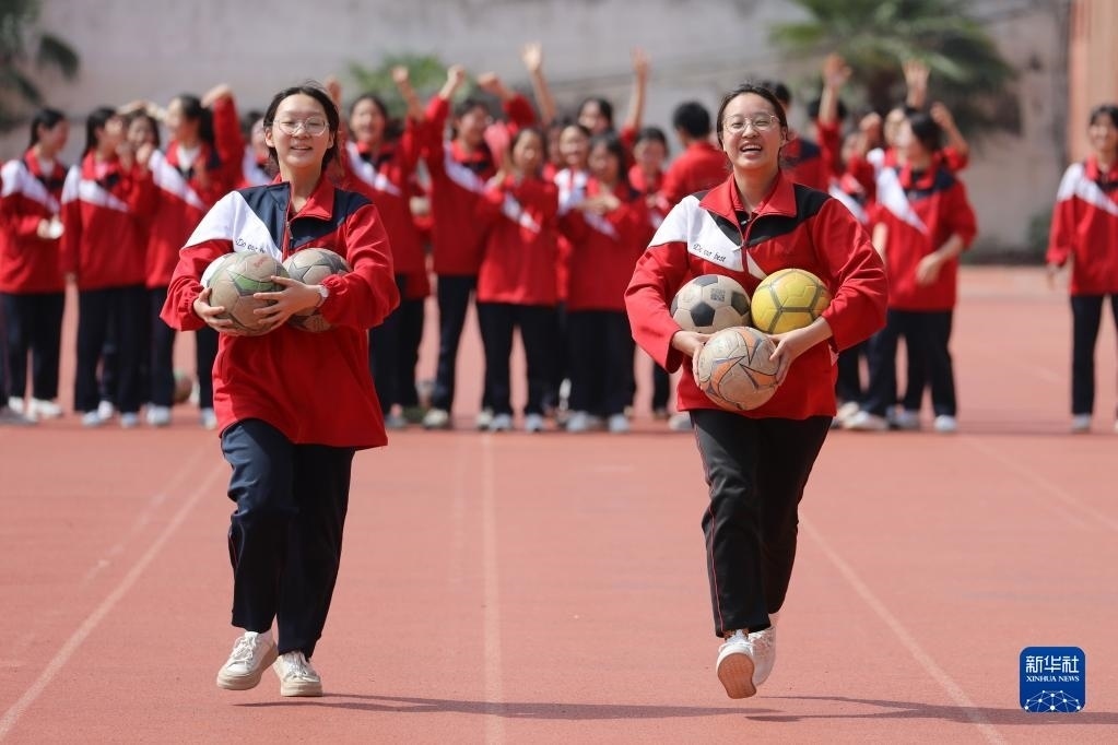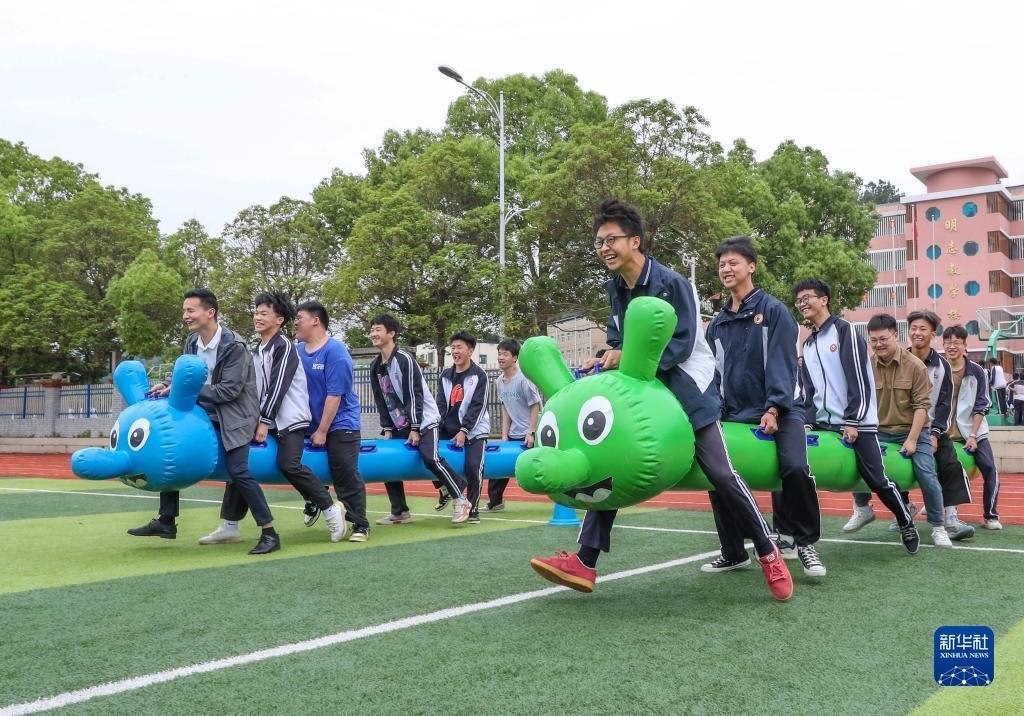 5月24日,在貴州省黔東南苗族侗族自治州岑鞏縣第一中學(xué),高三學(xué)生在足球場上做游戲減壓。