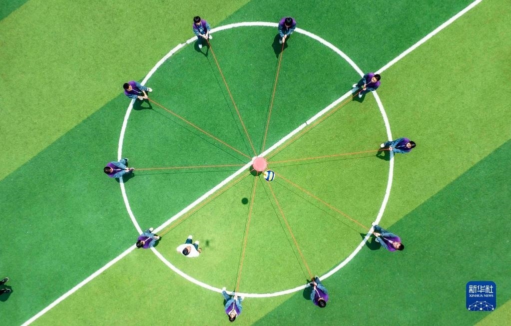 5月24日,貴州省黔西市樹立中學(xué)高三學(xué)生參加“同心擊鼓”游戲釋放壓力(無人機(jī)照片)。