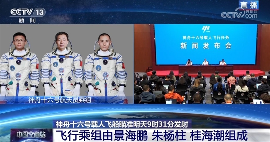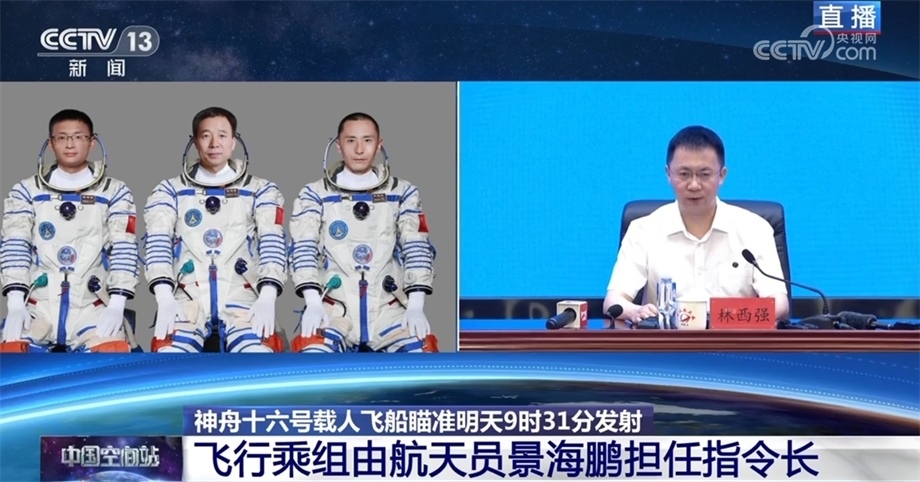 中國載人航天工程辦公室副主任、工程新聞發(fā)言人 林西強:受任務(wù)總指揮部委托,由我向大家介紹神舟十六號載人飛行任務(wù)有關(guān)情況。經(jīng)總指揮部研究決定,瞄準(zhǔn)北京時間5月30日9時31分發(fā)射神舟十六號載人飛船,飛行乘組由航天員景海鵬、朱楊柱和桂海潮組成,景海鵬擔(dān)任指令長。航天員景海鵬先后參加過神舟七號、九號、十一號載人飛行任務(wù),朱楊柱和桂海潮都是首次飛行。目前,執(zhí)行此次發(fā)射任務(wù)的長征二號F遙十六火箭即將開始加注推進劑。