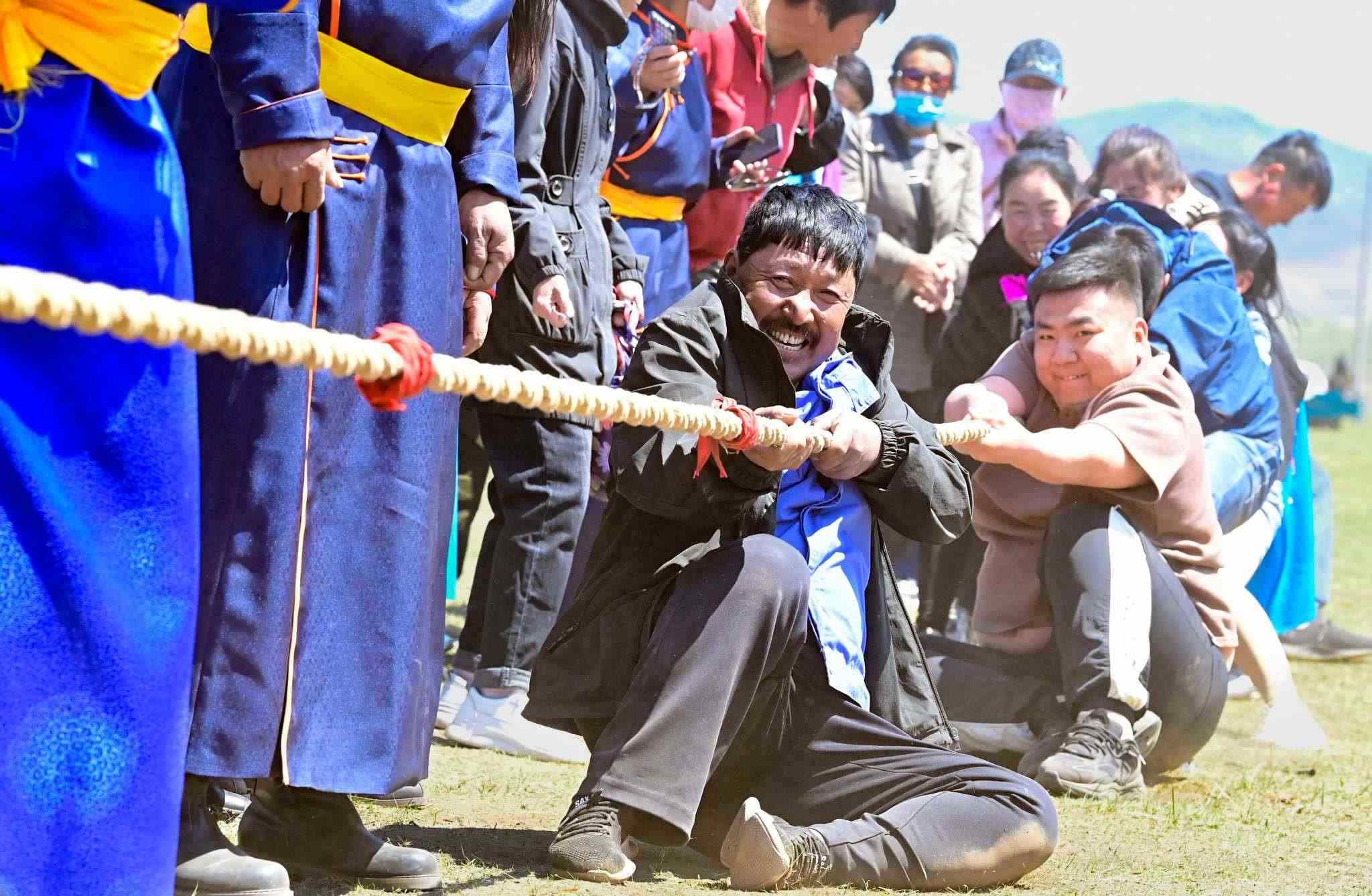 2023年5月26日,內(nèi)蒙古興安盟,科爾沁右翼前旗德伯斯鎮(zhèn)阿日林一合嘎查舉行首屆那達(dá)慕,設(shè)置的賽馬、布魯、搏克、拔河等傳統(tǒng)體育娛樂項(xiàng)目,吸引嘎查周邊500余名牧民參加比賽,喜慶牧業(yè)豐收季。視覺中國(guó)