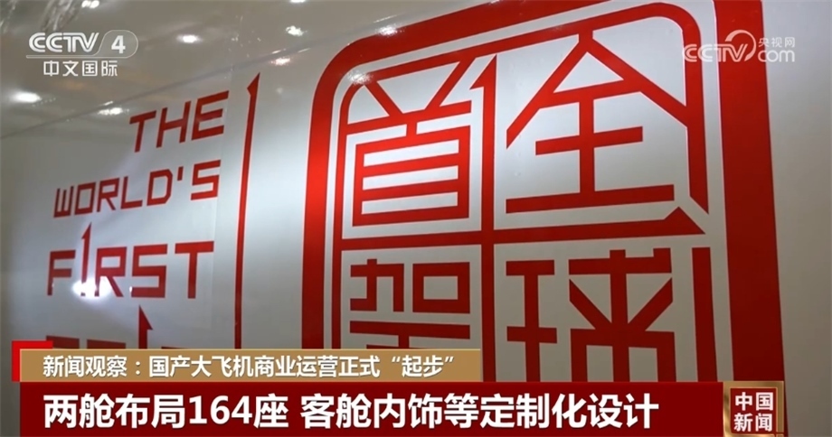 今天執(zhí)行商業(yè)首飛的C919飛機為164座兩艙布局,公務艙8座,經濟艙156座。客艙內飾、旅客座椅、機載娛樂系統(tǒng)和飛機外部涂裝做了定制化設計。機身前部印有“全球首架”的“中國印”標識和對應英文。飛機注冊號B-919A,“B”代表飛機的中國國籍,“919”和型號名稱契合,“A”則有首架之意,突顯這一全球新機型、全球首架的非凡意義。