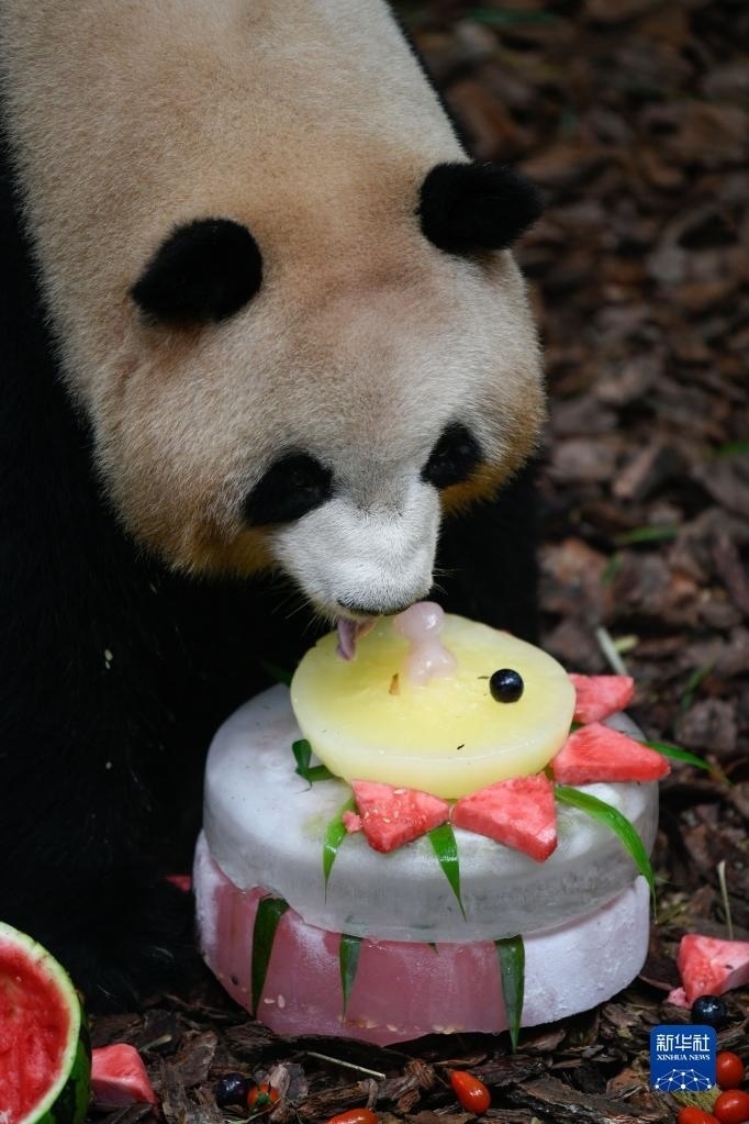 5月29日,在成都大熊貓繁育研究基地都江堰野放繁育研究中心,梅蘭在品嘗飼養(yǎng)員為它準(zhǔn)備的冰蛋糕。