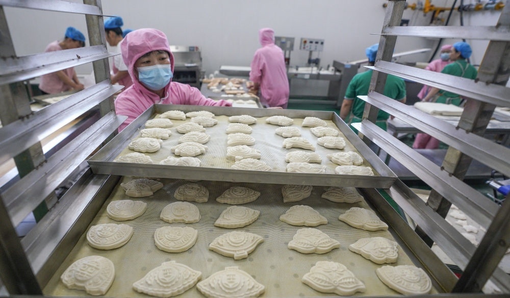 5月23日,工人在滄州渤海新區(qū)黃驊市河北銀海農(nóng)業(yè)科技有限公司面食生產(chǎn)車間搬運(yùn)面花。新華社記者 駱學(xué)峰 攝