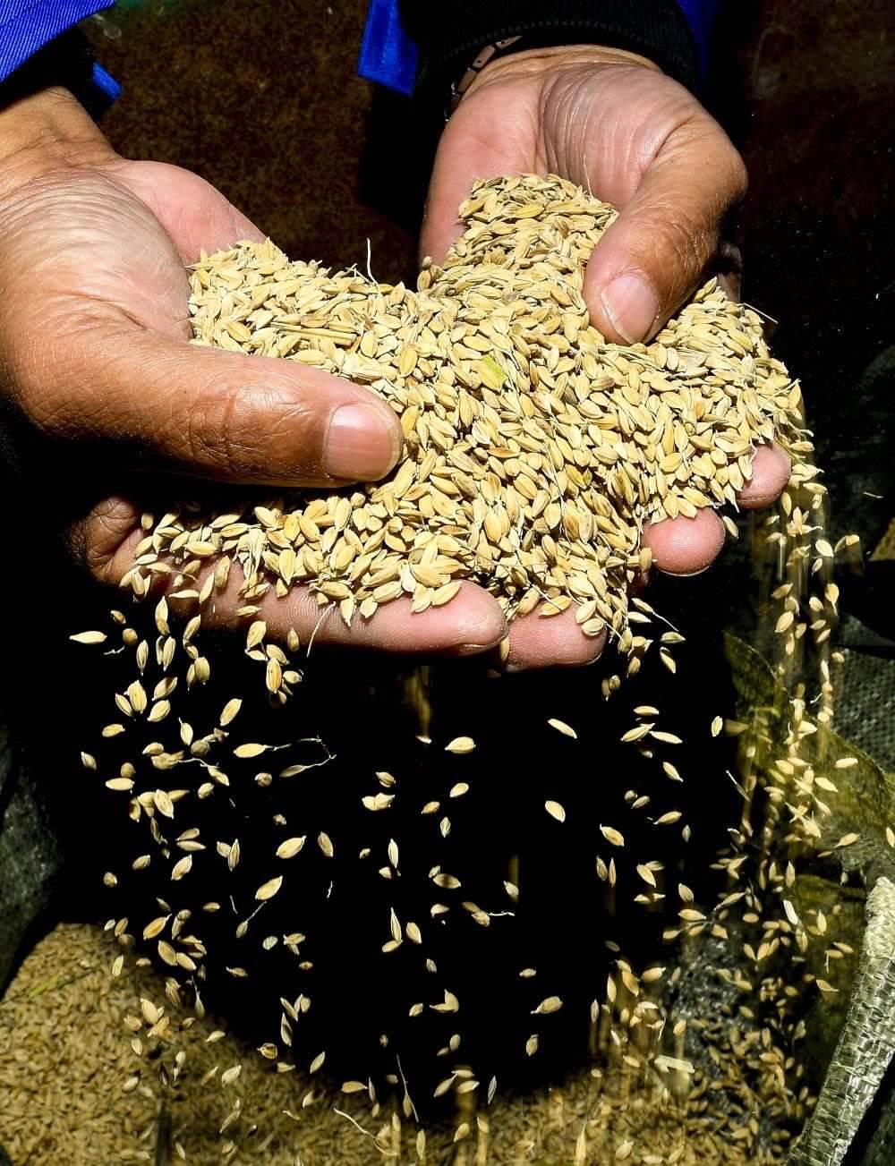 在吉林省大安市海坨鄉(xiāng)鹽堿地生態(tài)修復(fù)治理示范基地,農(nóng)民查看收獲的稻谷(2022年10月12日攝)。新華社記者 許暢 攝