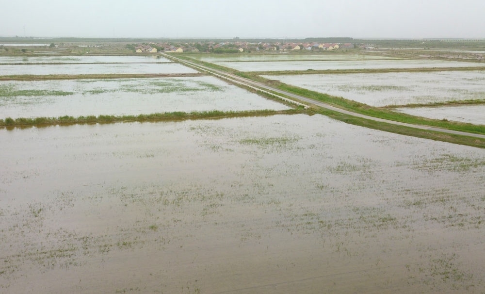 5月20日,山東省東營市墾利區(qū)黃河口鎮(zhèn),鹽堿地改良的田地上已播種海水稻秧苗(無人機(jī)照片)。新華社記者 徐速繪 攝