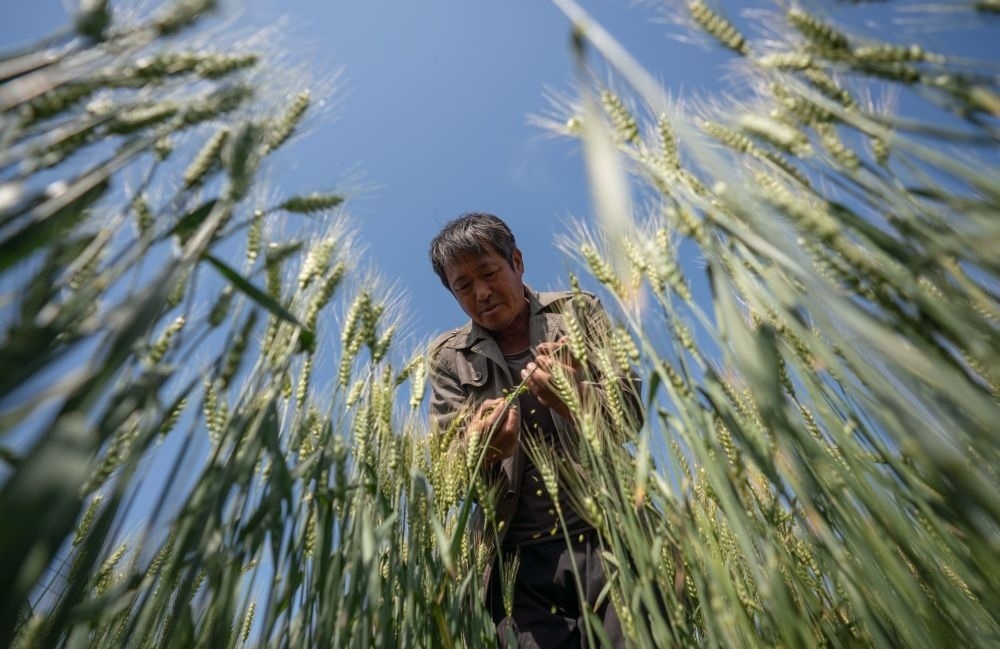 5月23日,農(nóng)民在河北滄州渤海新區(qū)黃驊市福源種植合作社的麥田里查看鹽堿地小麥長勢。新華社記者 駱學(xué)峰 攝