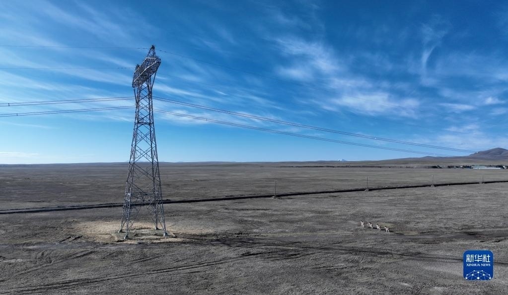6月4日, 在青海省海西蒙古族藏族自治州格爾木市唐古拉山鎮(zhèn)境內(nèi),幾只藏野驢從青藏聯(lián)網(wǎng)工程輸電鐵塔前經(jīng)過(無人機(jī)照片)。