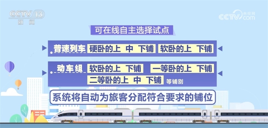 央視網消息:記者從國鐵集團獲悉,今天(6月10日)起,鐵路部門將在12306網站和12306手機客戶端試行在線選鋪服務。