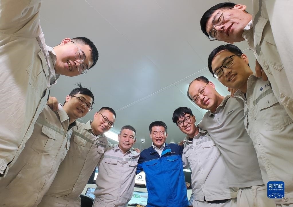 6月11日,在深中通道海底隧道管節(jié)最終接頭合龍后,中交一航局深中項(xiàng)目測管中心負(fù)責(zé)人鎖旭宏(中)和團(tuán)隊(duì)成員一起慶賀。