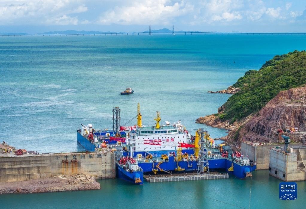 “一航津安1”號(hào)沉管運(yùn)輸安裝一體船拖帶E23管節(jié)和最終接頭從珠海桂山島啟航,前往沉放水域(6月8日攝,無人機(jī)照片)。