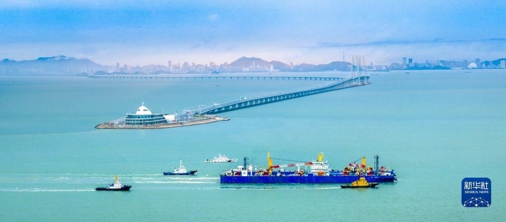 “一航津安1”號(hào)沉管運(yùn)輸安裝一體船將E23管節(jié)和最終接頭浮運(yùn)至安裝現(xiàn)場時(shí)經(jīng)過港珠澳大橋(6月8日攝,無人機(jī)照片)。