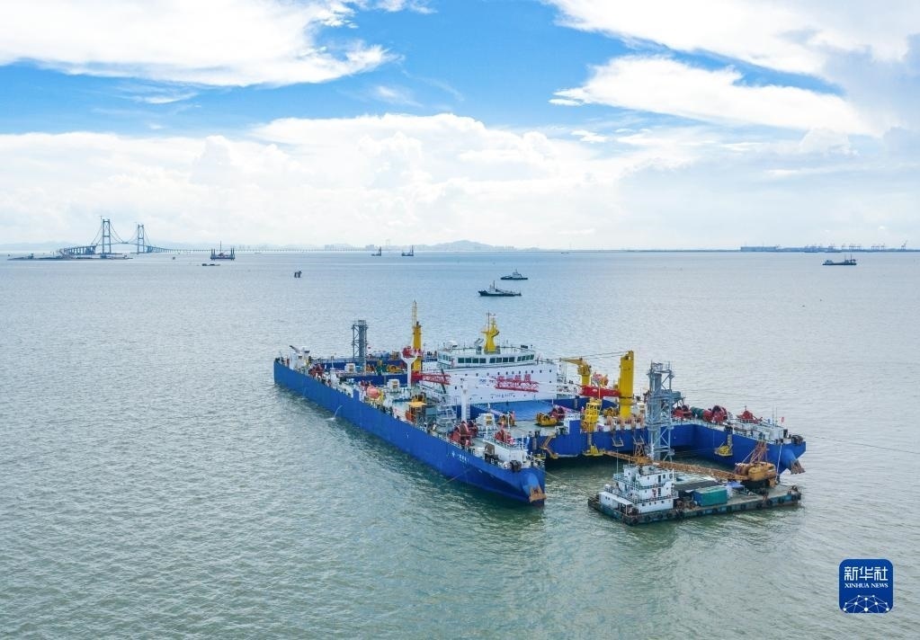 “一航津安1”號(hào)沉管運(yùn)輸安裝一體船在沉放安裝E23管節(jié)和最終接頭,背后是建設(shè)中的深中通道伶仃洋大橋(6月9日攝,無人機(jī)照片)。