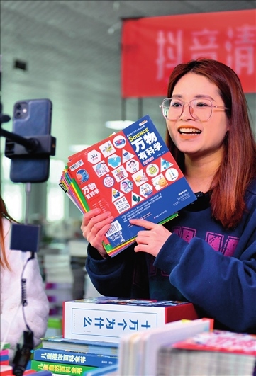 廊坊市永清經(jīng)濟(jì)開發(fā)區(qū)京聯(lián)集團(tuán)館配圖書聯(lián)合現(xiàn)采基地,工作人員在電商平臺(tái)直播銷售圖書(2023 年 3 月 26 日攝) 駱學(xué)峰攝 / 本刊