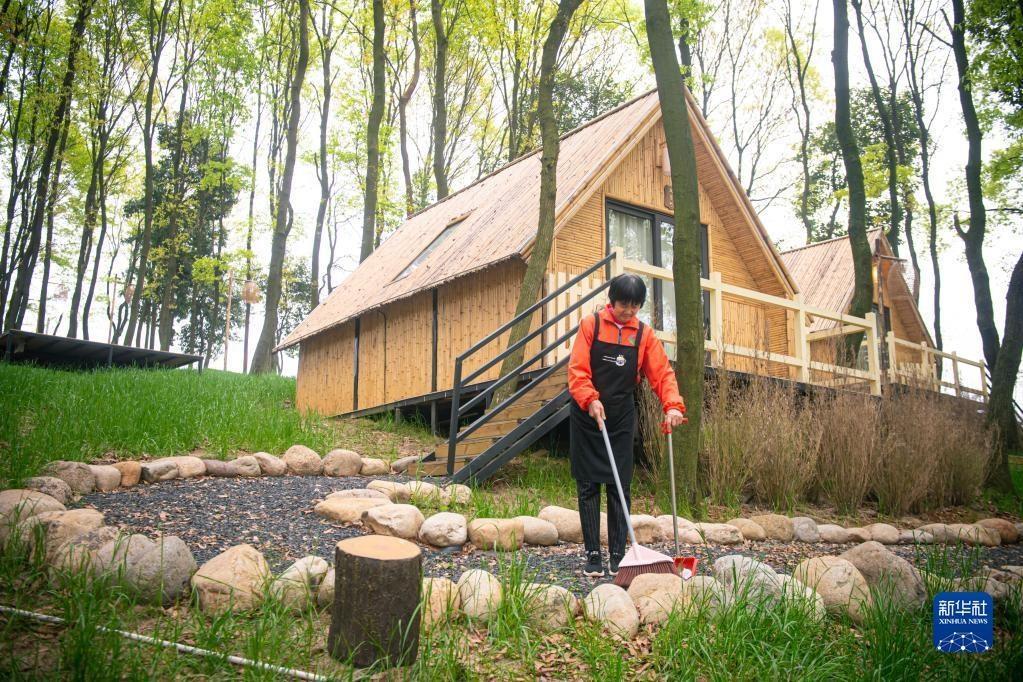 浙江諸暨楓橋鎮(zhèn)陽(yáng)春村村民在一家度假村內(nèi)工作(3月29日攝)。當(dāng)?shù)赝ㄟ^(guò)閑置荒山土地流轉(zhuǎn)發(fā)展鄉(xiāng)村旅游,幫助陽(yáng)春村60名村民實(shí)現(xiàn)在家門口就業(yè)增收。新華社記者 黃宗治 攝
