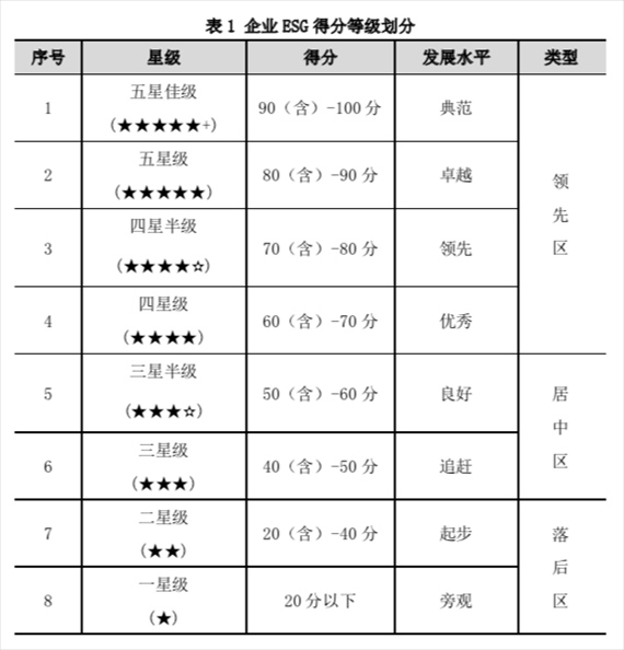 為直觀反映企業(yè)ESG水平,將ESG指數(shù)劃分為八個(gè)等級(jí),分別為:五星佳級(jí)、五星級(jí)、四星半級(jí)、四星級(jí)、三星半級(jí)、三星級(jí)、二星級(jí)和一星級(jí),各類企業(yè)對(duì)應(yīng)的星級(jí)水平和ESG發(fā)展水平見(jiàn)表1。