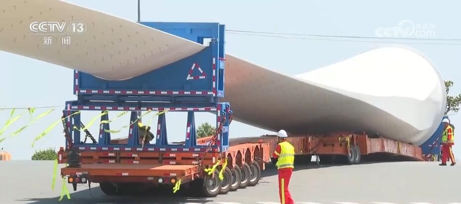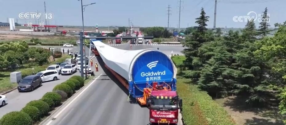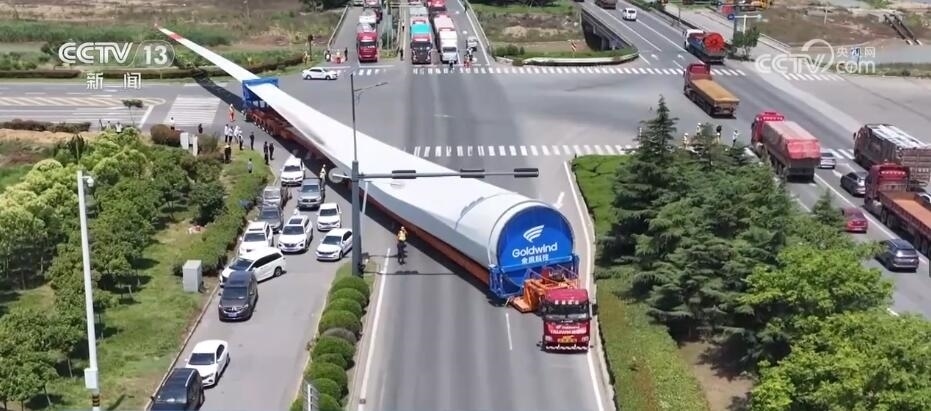 央視網(wǎng)消息:今天(6月14日)上午,100%我國自主知識產(chǎn)權(quán)的123米超長海上風(fēng)電葉片在江蘇連云港啟動(dòng)陸地轉(zhuǎn)運(yùn)工作。上午9時(shí),代表著我國風(fēng)電裝備最新技術(shù)水準(zhǔn)的大葉片,從廠區(qū)到港口碼頭,陸地運(yùn)輸全程約30公里,耗時(shí)約3到4個(gè)小時(shí),其中運(yùn)輸大葉片的車輛還要拐過90度的直角彎。如此大體量的裝備運(yùn)輸是一個(gè)復(fù)雜的過程,其中有哪些技術(shù)難點(diǎn)?來看記者今天上午從現(xiàn)場發(fā)回的報(bào)道。