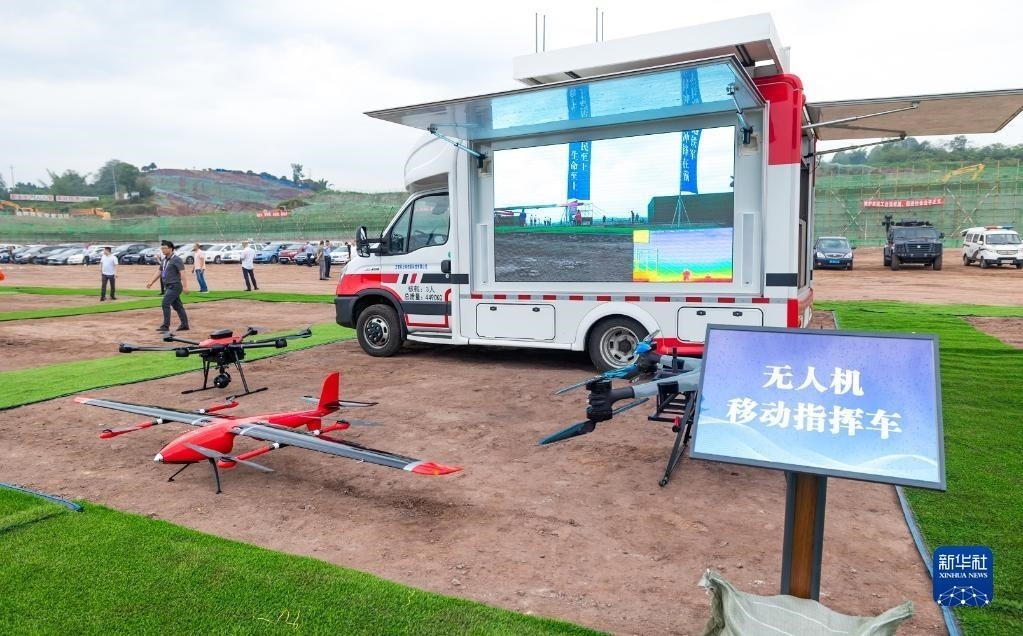 這是演練現(xiàn)場展示的無人機(jī)移動(dòng)指揮車(6月14日攝)。