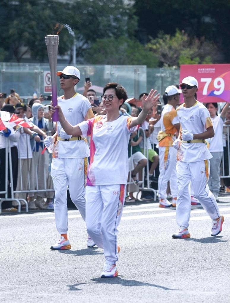 9月8日,火炬手羅雪娟在火炬?zhèn)鬟f中。當(dāng)日,杭州亞運(yùn)會(huì)火炬?zhèn)鬟f在杭州西湖涌金公園廣場啟動(dòng),共有106棒火炬手參與當(dāng)日傳遞。新華社記者孫非 攝