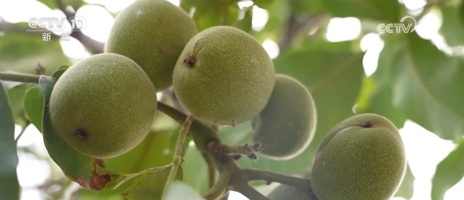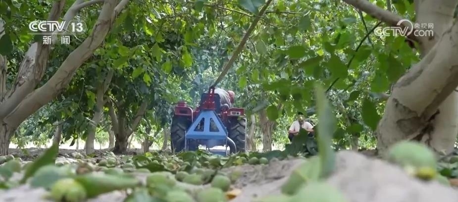 總臺(tái)記者 卜鵬:這里是位于新疆阿克蘇地區(qū)溫宿縣的一處核桃種植基地,這段時(shí)間正是當(dāng)?shù)睾颂页墒觳烧募竟?jié)。這些核桃樹上,一顆顆青綠渾圓的核桃掛滿枝頭,而在核桃樹底下,當(dāng)?shù)氐墓r(nóng)們正在抓緊撿收被抖落的核桃。為什么說是被抖落的核桃而不是被敲落的核桃?那是因?yàn)椋诋?dāng)?shù)匾恍┓N植面積比較大的核桃基地里,當(dāng)?shù)氐墓r(nóng)會(huì)選擇利用農(nóng)業(yè)機(jī)械輔助抖動(dòng)樹干的方式來采收核桃。采收的時(shí)候,果農(nóng)們會(huì)把繩索捆綁在核桃樹上,負(fù)責(zé)機(jī)械操作的師傅會(huì)根據(jù)樹枝的粗細(xì)來掌握和控制抖動(dòng)的力度,這樣就能夠避免因?yàn)橛昧^猛而對(duì)樹枝產(chǎn)生傷害。經(jīng)過機(jī)器的搖擺,核桃就會(huì)接二連三落在地上,相比于人工采摘,機(jī)械采摘的方式效率會(huì)更高。