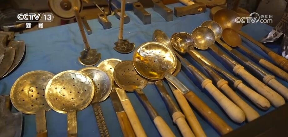 總臺(tái)記者 劉菲:如今的古城最吸引人們的并非熱鬧的商業(yè)街,而是一個(gè)個(gè)非物質(zhì)文化遺產(chǎn)的手工制作,現(xiàn)在在古城里有20多種的非遺制作。在很多年前我曾經(jīng)來(lái)過(guò)這里,這里就是一個(gè)小小的鐵匠鋪,而如今再來(lái)到這兒,已經(jīng)變成了一個(gè)打鐵技藝的展示館。小到一個(gè)湯勺,大到生產(chǎn)農(nóng)具,聽(tīng)著這打鐵的聲音,也仿佛把我?guī)Щ亓水?dāng)年。