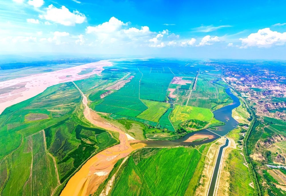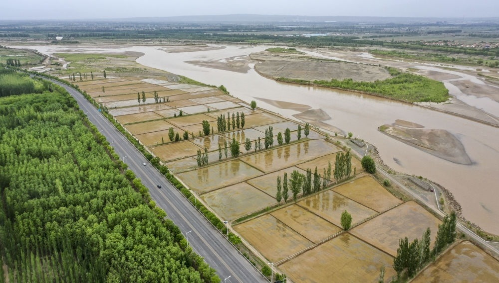 流經寧夏青銅峽市境內的黃河,滋潤著岸邊水稻和各種植被(無人機照片,5月25日攝)。新華社記者馮開華 攝