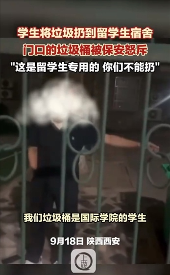 ·西安交大學生用留學生宿舍垃圾桶遭保安怒斥,學校回應:會對相關人員進行批評教育。