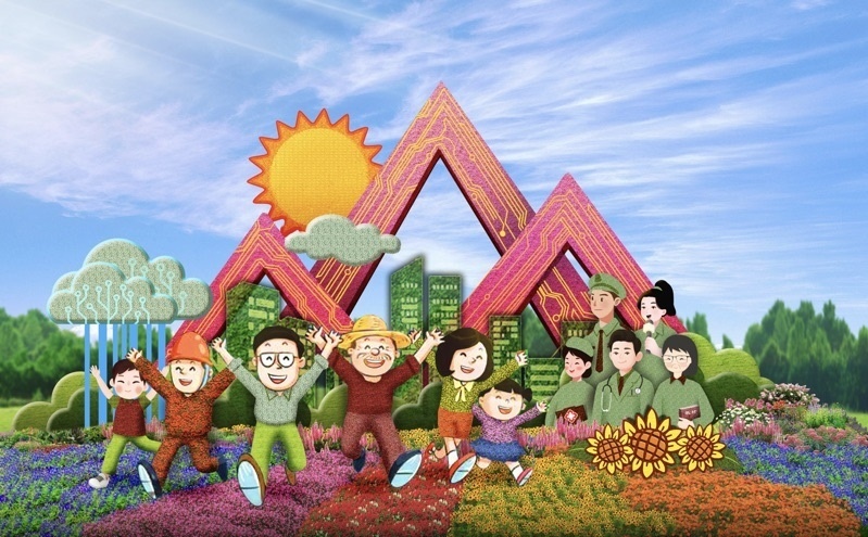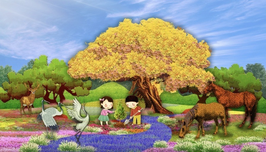 4,東單西北角的“和諧共生”花壇頂高8.5米,“三北工程”綠色長城為主景,配以野馬(西北)、麋鹿(華北)、白鶴(東北)、胡楊等典型物種,體現(xiàn)了生態(tài)治理的典范,寓意堅定不移走好人與自然和諧共生的中國式現(xiàn)代化之路。