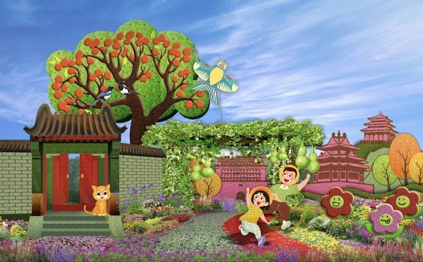 3,東單東南角的“共同富?!敝黝}花壇頂高達(dá)9.5米,以欣欣向榮的城鄉(xiāng)融合發(fā)展為場景,描繪了中國式現(xiàn)代化全體人民共同富裕的美好藍(lán)圖。