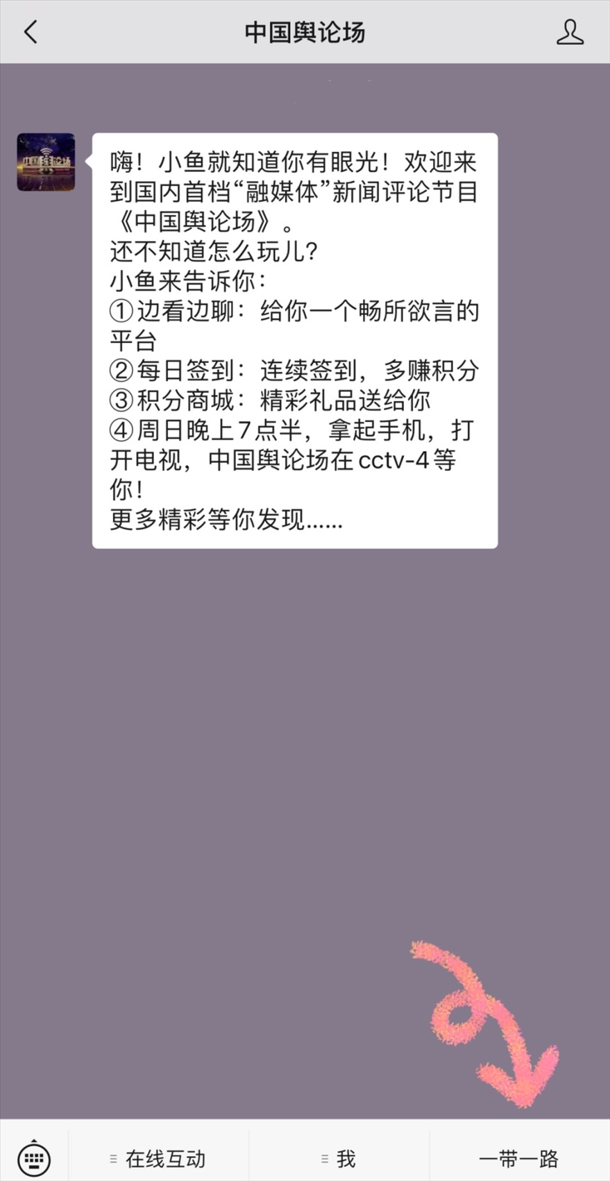 掃描下方二維碼,關(guān)注《中國(guó)輿論場(chǎng)》微信公眾號(hào),給我們留言;點(diǎn)擊【一帶一路】,進(jìn)入征集令頁(yè)面發(fā)送留言;點(diǎn)擊下方閱讀原文留言;如果您有圖片或視頻展示也可以直接發(fā)送到我們的郵箱(cctv4zgylc@163.com)參與征集活動(dòng)。被選中的留言、圖片和視頻將有機(jī)會(huì)在《中國(guó)輿論場(chǎng)》全媒體平臺(tái)上展示。