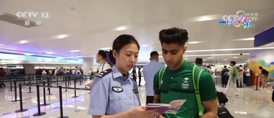 記者看到,在杭州機場口岸入境現(xiàn)場,杭州邊檢站設(shè)置了中英文對照的亞運會通關(guān)指示標識。配備了具備泰語、韓語、日語、阿拉伯語等多語種能力的檢查員,并在現(xiàn)場向入境的運動員發(fā)放、介紹亞運會服務(wù)指南。