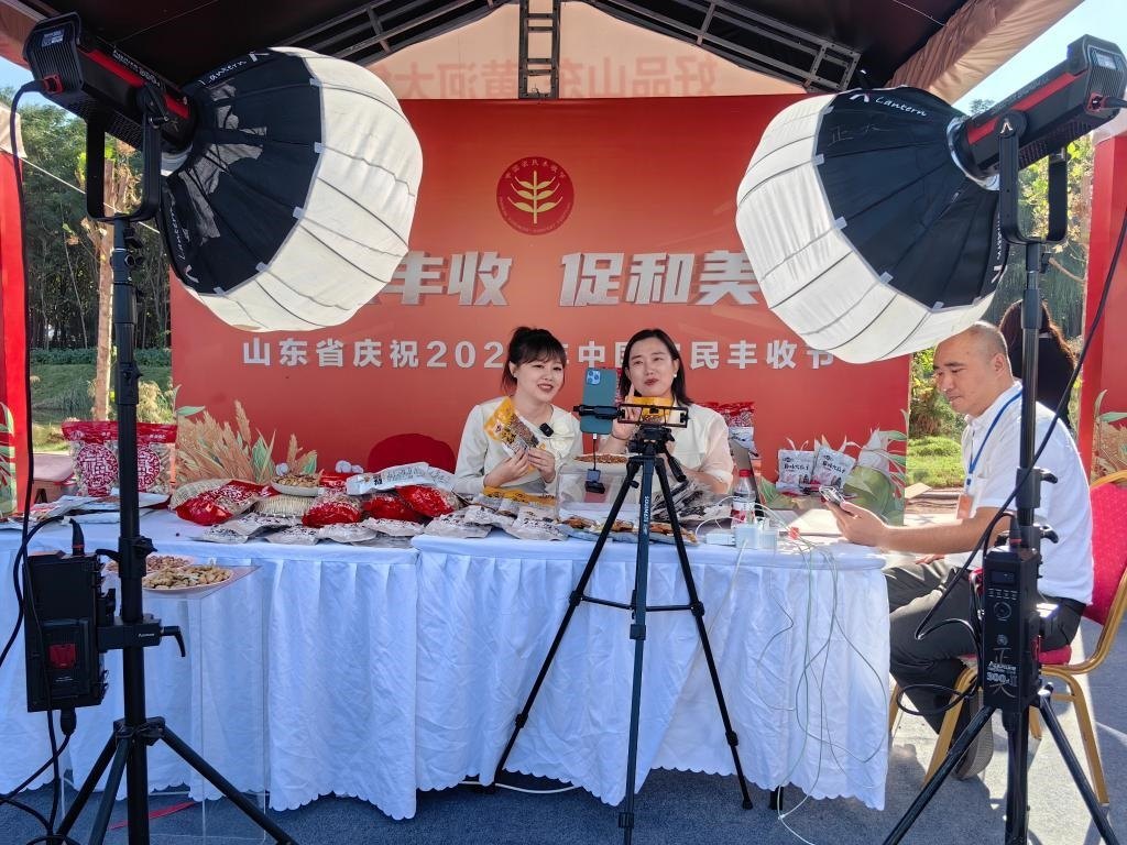 活動(dòng)現(xiàn)場,主播在直播帶貨山東特色農(nóng)產(chǎn)品。新華社記者 張力元 攝