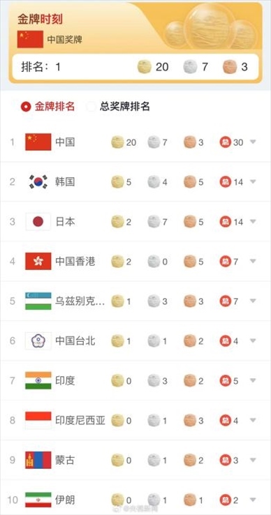 ·杭州亞運(yùn)會(huì)首日中國隊(duì)斬獲20金7銀3銅,位列獎(jiǎng)牌榜第一名。