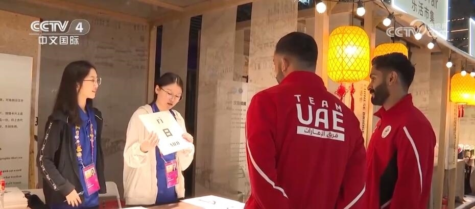 阿拉伯聯(lián)合酋長國的擊劍隊(duì)隨隊(duì)官員們也在文化市集上興致勃勃地體驗(yàn)甲骨文猜字謎游戲。