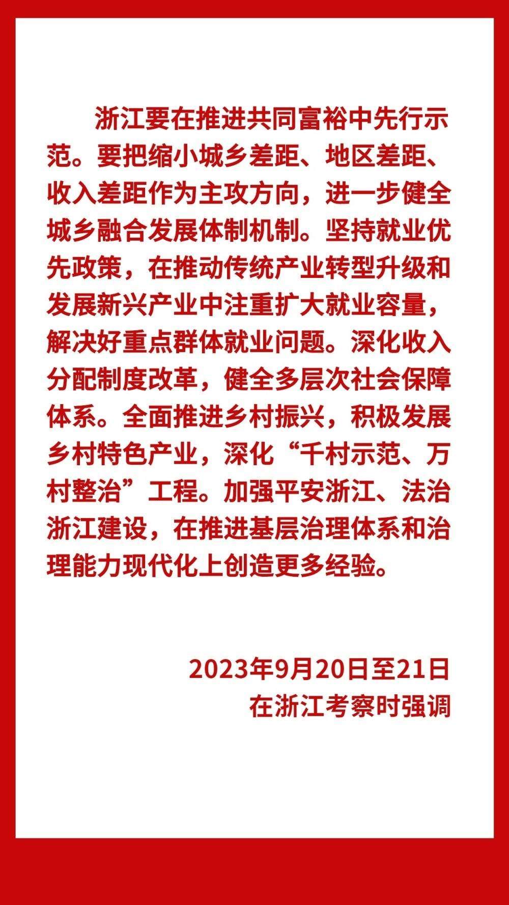 9月20日至21日,中共中央總書記、國家主席、中央軍委主席習(xí)近平在浙江考察。20日上午,習(xí)近平來到金華市義烏市后宅街道李祖村考察調(diào)研,先后在村黨群服務(wù)中心、“共富市集”、扎染商鋪等場所了解李祖村發(fā)展變化情況。他說,李祖村扎實推進(jìn)共同富裕,是浙江“千萬工程”顯著成效的一個縮影,要再接再厲,在推動鄉(xiāng)村振興上取得更大成績。鄉(xiāng)村振興潛力無限、大有可為,鄉(xiāng)親們要努力奮斗,一起奔向共同富裕的美好明天。