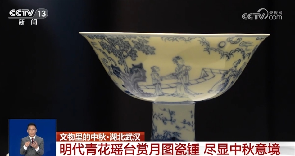 湖北省博物館珍藏的這件明代青花瑤臺(tái)賞月圖瓷鍾,造型獨(dú)特、工藝精湛,繪有遠(yuǎn)山、祥云、花草以及三組人物,這三組人物共賞一輪圓月,意境優(yōu)美。