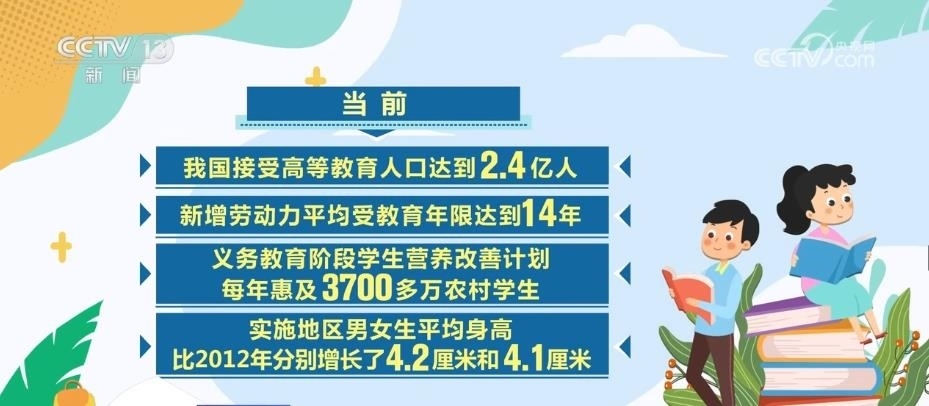 當前,我國接受高等教育人口達到2.4億人,新增勞動力平均受教育年限達到14年。義務教育階段學生營養(yǎng)改善計劃每年惠及3700多萬農(nóng)村學生,實施地區(qū)男女生平均身高比2012年分別增長了4.2厘米和4.1厘米。