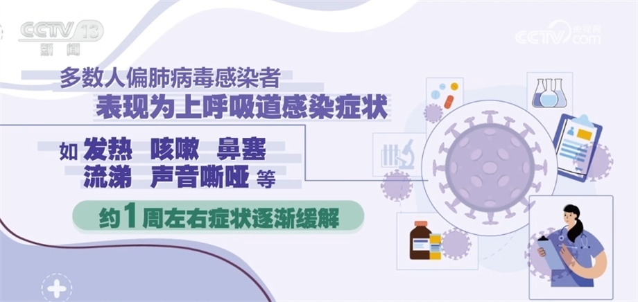 《人偏肺病毒感染診療方案(2023年版)》指出,人偏肺病毒感染者是主要傳染源。從潛伏期末到急性期都有傳染性。主要通過飛沫和密切接觸傳播,也可以通過接觸被病毒污染的物品間接傳播。人偏肺病毒人群普遍易感,在5歲以下兒童、老年人和免疫功能低下的人群中更為多見,潛伏期為3天—9天,多為3天—6天。多數(shù)人偏肺病毒感染者表現(xiàn)為上呼吸道感染癥狀,如發(fā)熱、咳嗽、鼻塞、流涕、聲音嘶啞等,約1周左右癥狀逐漸緩解。鑒于目前尚無證據(jù)證明有對人偏肺病毒有效的特異性抗病毒藥物,不建議使用抗病毒藥物進(jìn)行治療。避免盲目或不恰當(dāng)使用抗菌藥物,尤其是聯(lián)合使用廣譜抗菌藥物。