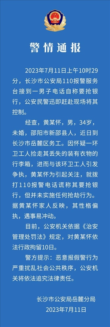 ·一人因與環(huán)衛(wèi)工人引發(fā)爭執(zhí),為引起關(guān)注,撥打110報警電話謊稱要搶銀行。長沙警方通報,對其依法行政拘留10日。