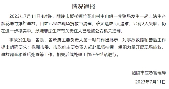 ·11日,湖南醴陵發(fā)生一起非法生產(chǎn)煙花爆竹爆炸事故,造成5人遇難,2人失聯(lián),涉嫌非法生產(chǎn)有關(guān)責(zé)任人已被公安機關(guān)控制,案件仍在進(jìn)一步核實中。