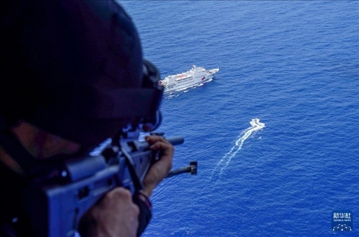 7月10日,中國海軍“和平方舟”號醫(yī)院船在太平洋上組織反恐反海盜演練。這是空中打擊組進(jìn)行火力支援。