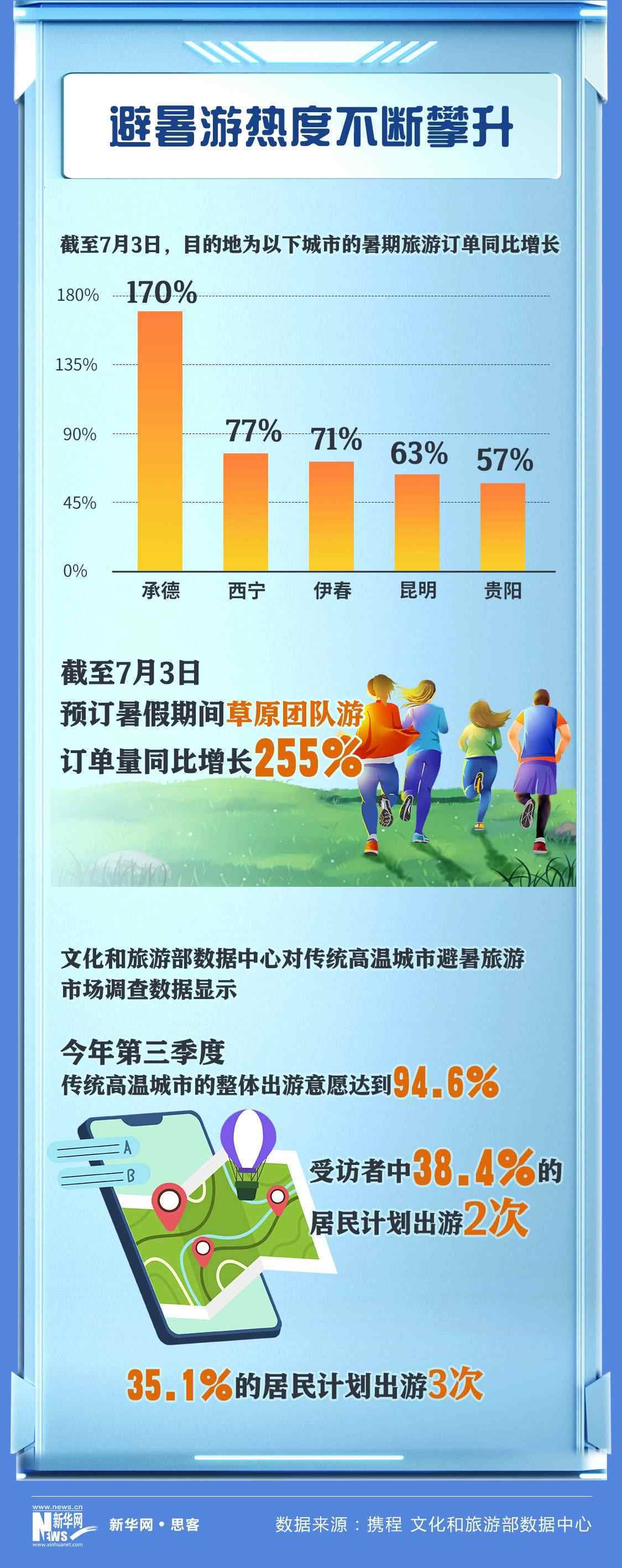 文化和旅游部數(shù)據(jù)中心不久前對(duì)傳統(tǒng)高溫城市避暑旅游市場(chǎng)調(diào)查數(shù)據(jù)顯示,今年第三季度傳統(tǒng)高溫城市的整體出游意愿達(dá)到94.6%,受訪者中38.4%的居民計(jì)劃出游2次,35.1%的居民計(jì)劃出游3次。