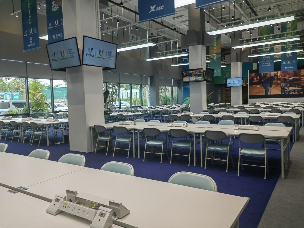 成都大運(yùn)會主媒體中心內(nèi)的媒體工作區(qū)。新華社記者董小紅攝