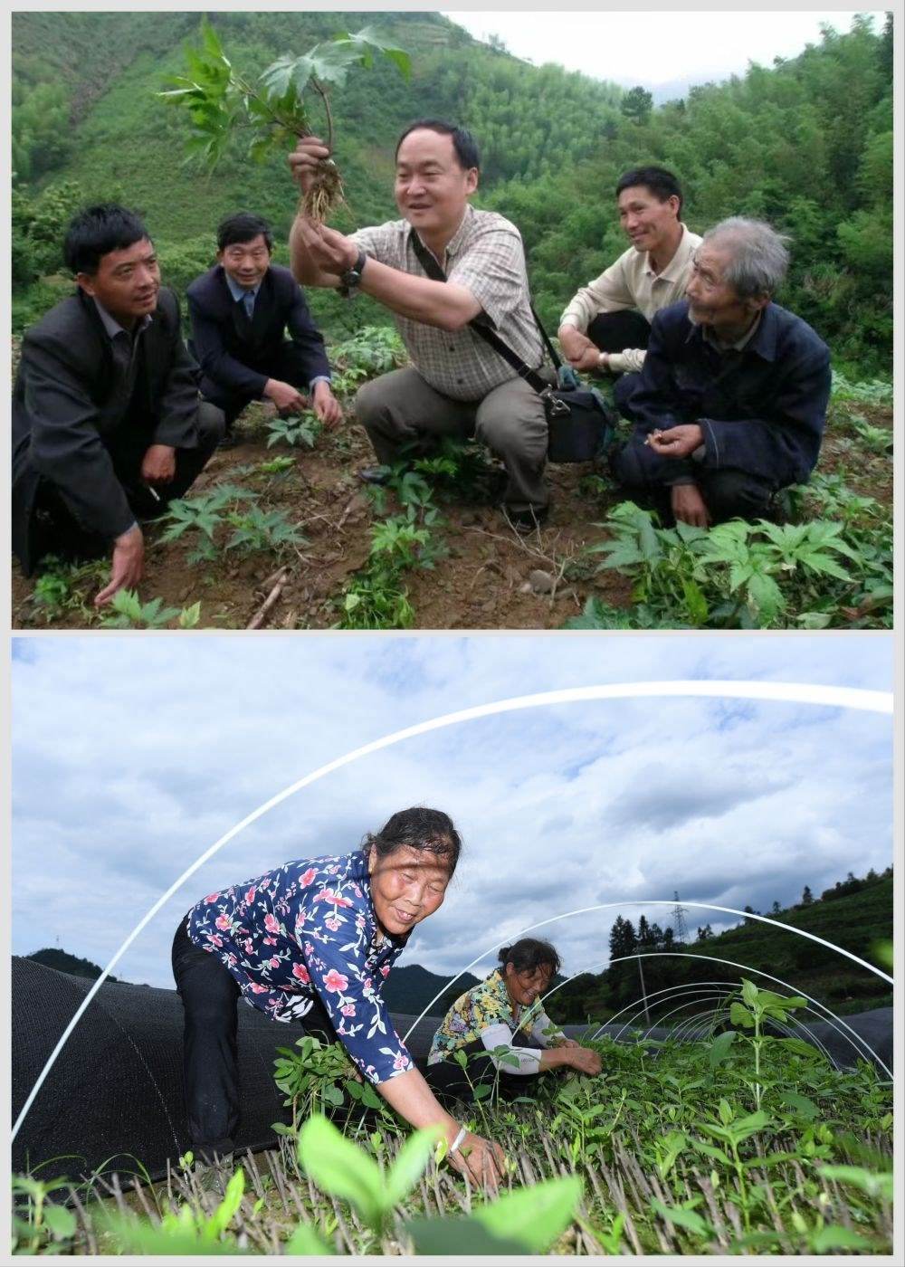 拼版照片:上圖為浙江省中藥研究所有限公司正高級工程師俞旭平(中)向淳安縣下姜村村民傳授中藥材種植技能(資料照片);下圖為7月3日,村民在淳安縣下姜村一片種植基地查看中藥材扦插苗的生長情況(新華社記者翁忻旸攝)。新華社發(fā)