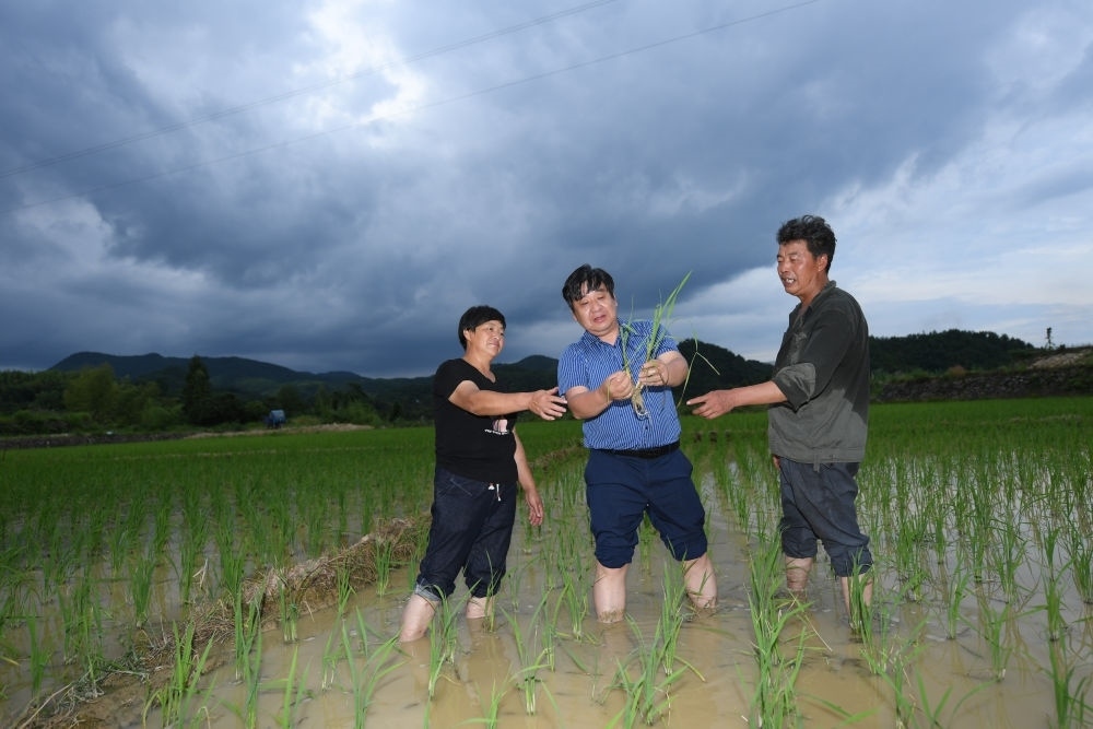 在浙江省仙居縣廣度鄉(xiāng)西角村,浙江大學(xué)環(huán)境與資源學(xué)院教授吳良歡(中)在省級科研試驗田里指導(dǎo)農(nóng)戶進行水稻種植(7月4日攝)。新華社記者 翁忻旸 攝