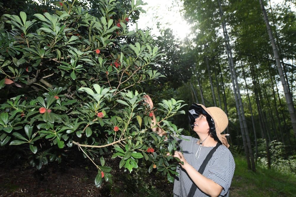 在浙江省仙居縣廣度鄉(xiāng)瓦垚頭村,浙江大學(xué)環(huán)境與資源學(xué)院教授吳良歡結(jié)對指導(dǎo)的村民鄭文娟在查看楊梅長勢(7月4日攝)。新華社記者 翁忻旸 攝