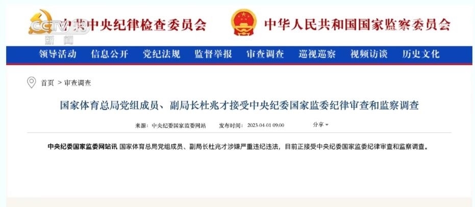 總臺央視記者 宋琎:今年3月27日,二十屆中央首輪巡視對象名單公布?!皩殷w育總局黨組開展機(jī)動巡視”這一消息迅速成為社會熱點。之后不到一周,中央紀(jì)委國家監(jiān)委通報,時任國家體育總局黨組成員、副局長杜兆才接受審查調(diào)查。體育領(lǐng)域反腐成為今年反腐敗工作的一大重點。