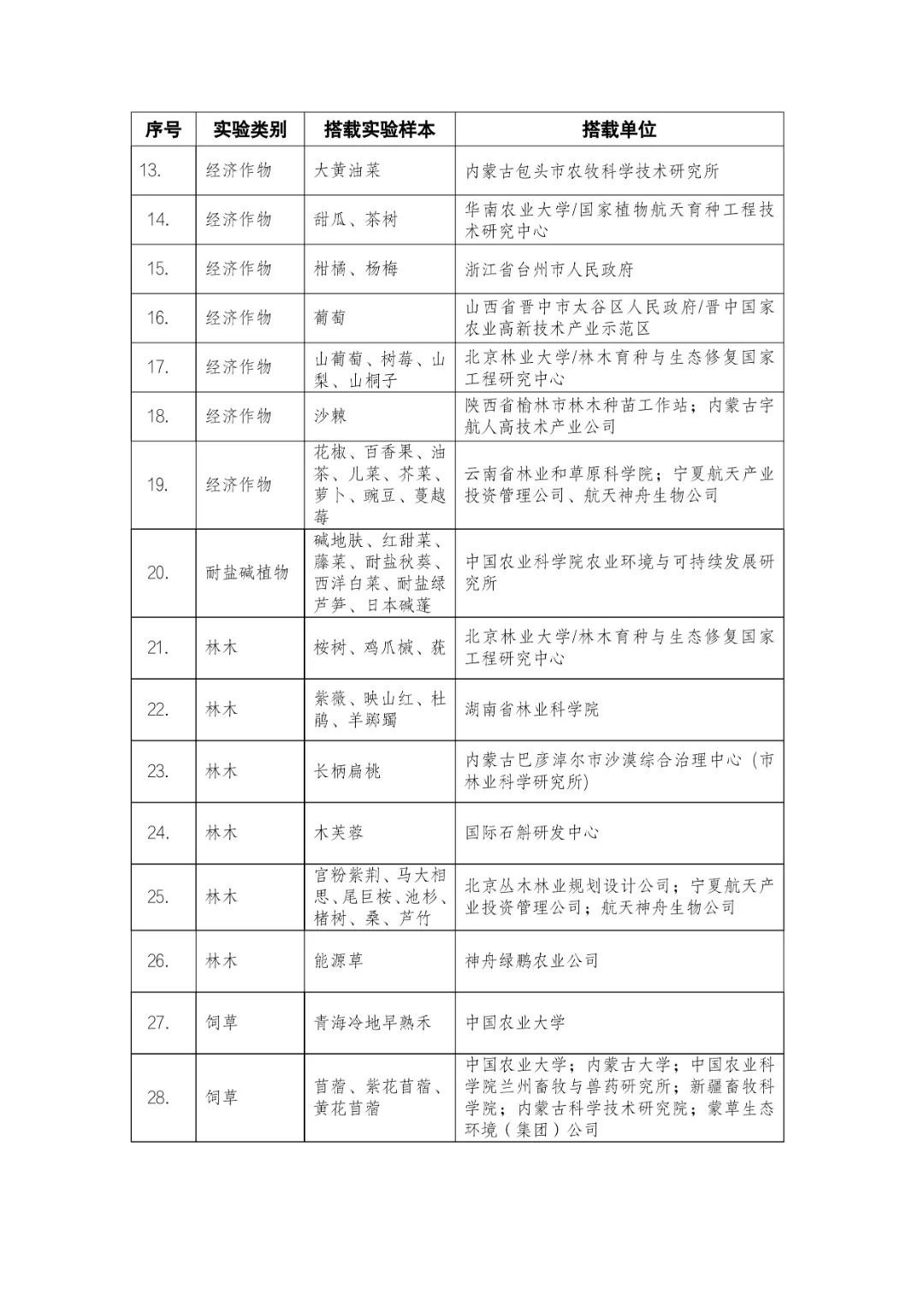 載人航天工程立項(xiàng)實(shí)施以來,始終注重提升工程綜合效益,致力服務(wù)國家經(jīng)濟(jì)社會(huì)發(fā)展。在工程歷次飛行任務(wù)中,均安排了航天育種搭載實(shí)驗(yàn)項(xiàng)目。從神舟十六號(hào)載人飛船開始,中國載人航天工程辦公室向社會(huì)公開征集航天育種搭載實(shí)驗(yàn)項(xiàng)目,于3月23日在工程官網(wǎng)發(fā)布《關(guān)于征集神舟系列載人飛船航天育種實(shí)驗(yàn)項(xiàng)目的機(jī)會(huì)公告》,同時(shí)在工程官網(wǎng)開辟“航天育種搭載實(shí)驗(yàn)”管理平臺(tái),接受搭載需求單位申報(bào)實(shí)驗(yàn)項(xiàng)目。辦公室組織專家對(duì)申報(bào)項(xiàng)目進(jìn)行評(píng)審,遴選出53個(gè)單位的136種份航天育種實(shí)驗(yàn)材料實(shí)施搭載。包括農(nóng)作物47份(糧食作物種子12份、經(jīng)濟(jì)作物種子28份、耐鹽堿植物7份);林草、花卉和藥用植物76份(林木17份、飼草21份、花卉7份、藥用植物31份);微生物和其它13種(農(nóng)業(yè)微生物菌種2種、工業(yè)微生物菌種3種、食用菌3種、藻類和苔蘚5種)(清單附后)。