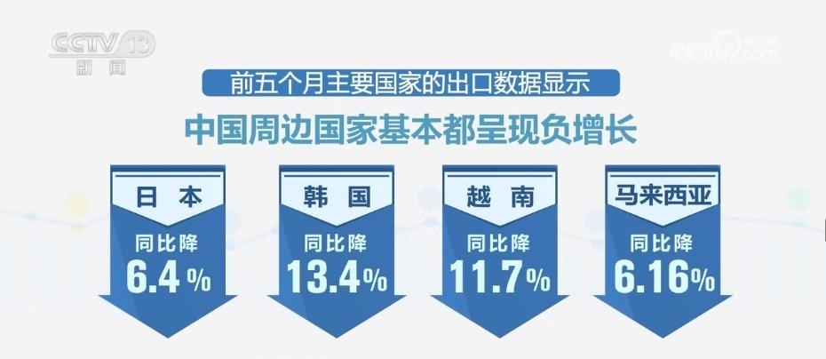 當(dāng)記者查閱主要國家前5個月的進(jìn)口數(shù)據(jù)時發(fā)現(xiàn),主要國家進(jìn)口額普遍下降,全球需求不振持續(xù)顯現(xiàn)。而前5個月主要國家的出口數(shù)據(jù)也顯示,中國周邊國家基本都呈現(xiàn)負(fù)增長,日本同比降6.4%、韓國同比降13.4%、越南同比降11.7%、馬來西亞同比降6.16%。